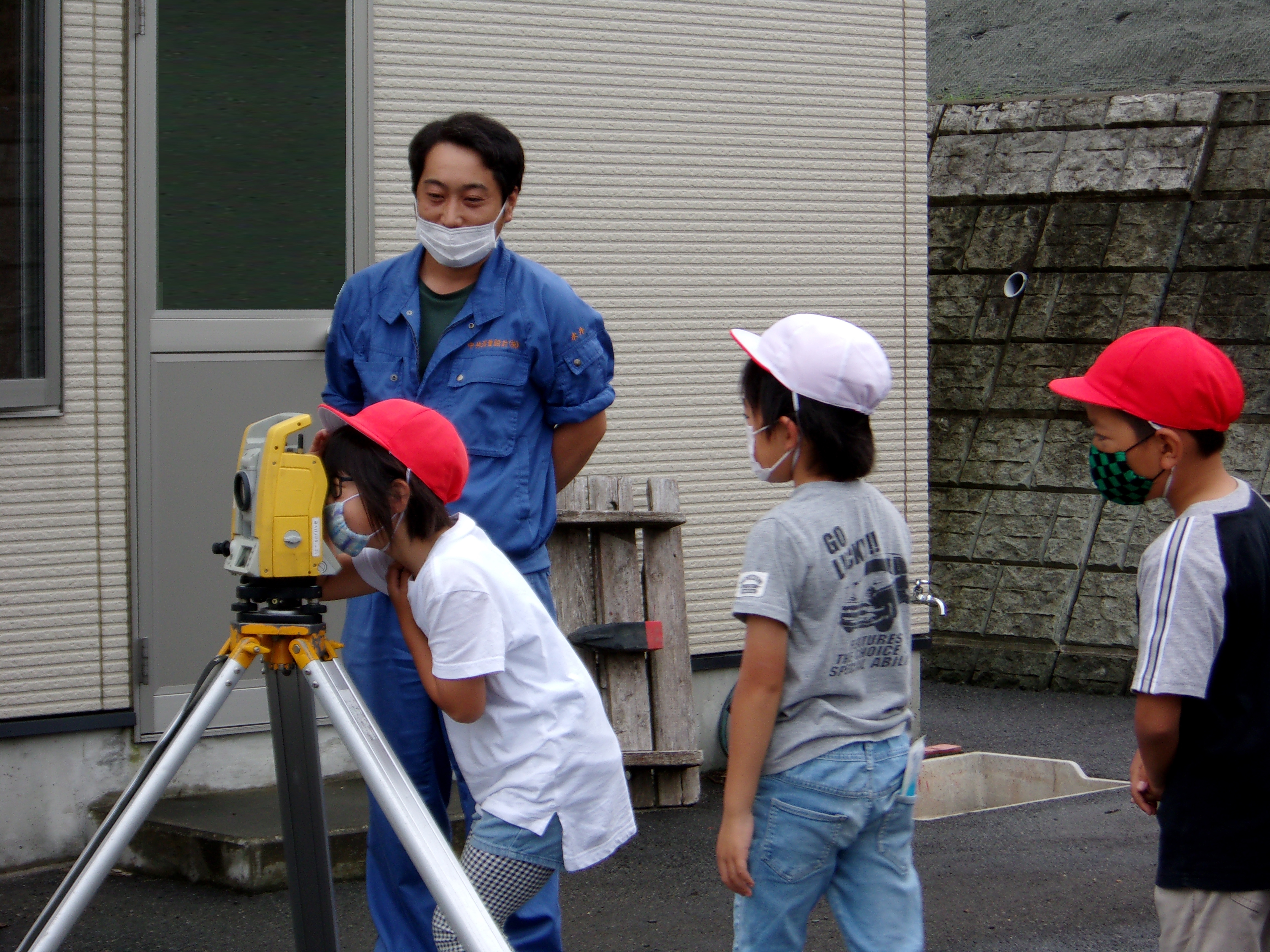 外では実際に測量機器に触れてもらい、距離当てゲームで”測量の第一歩”を踏んでもらいました。